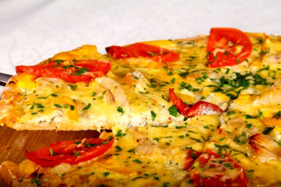 Sauce tomate, cantal (AOC), poulet curry cuisiné maison, œuf, poivrons frais, crème fraiche, olives
