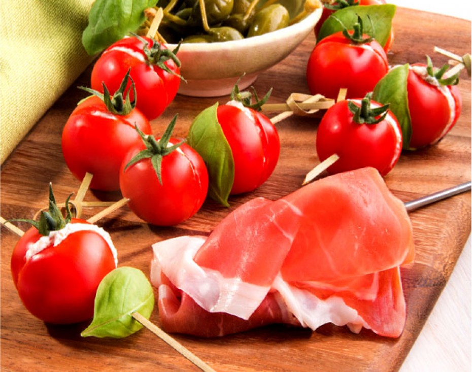 Sauce tomate, cantal (AOC), jambon supérieur fumé (Parme), tomates fraiches du marché, basilic, parmesan, olives, origan