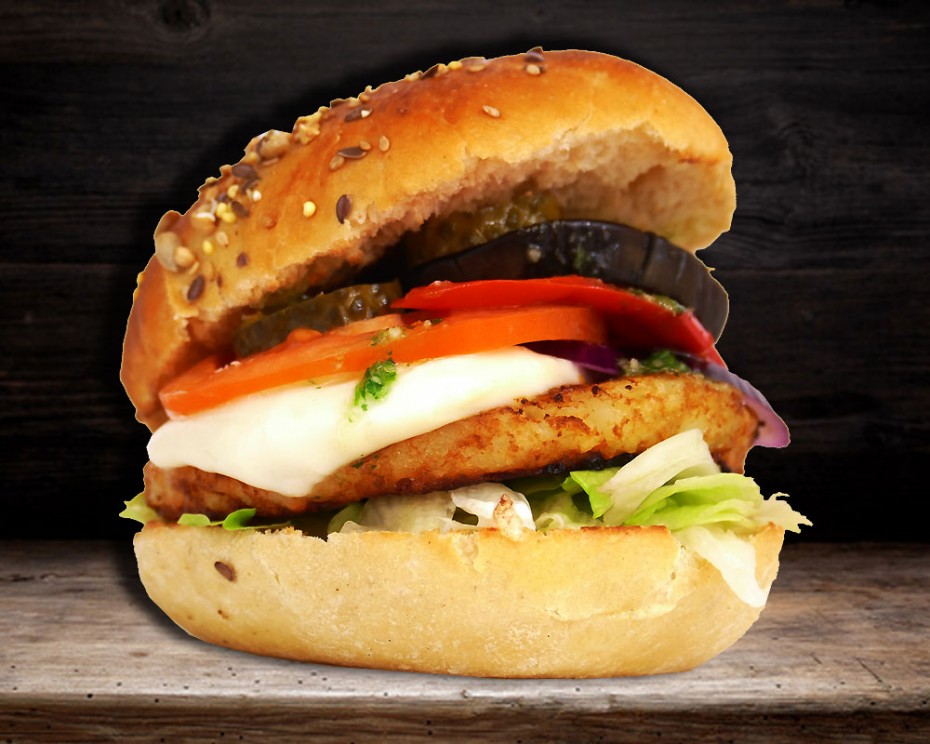Pain artisanal Pierre BOUR, galette de pomme de terre, persillade maison, poivrons et aubergines cuits au feu de bois, Salade iceberg, tomate fraîche, oignons caramélisés cornichons