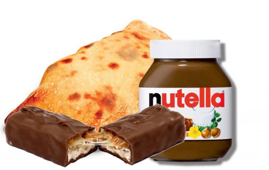Une délicieuse pâte à Pizza au four à bois façonnée en croissant avec beaucoup de Nutella et soupoudrée de sucre glace + du SNIKERS Fondant
