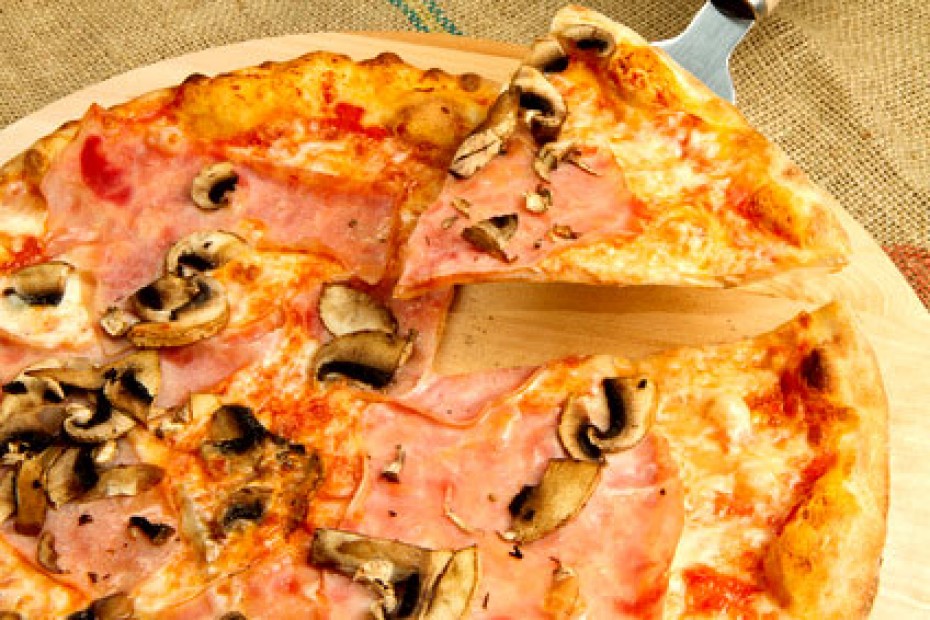 Sauce tomate, champignons de Paris frais, cantal (AOC), jambon supérieur, olives